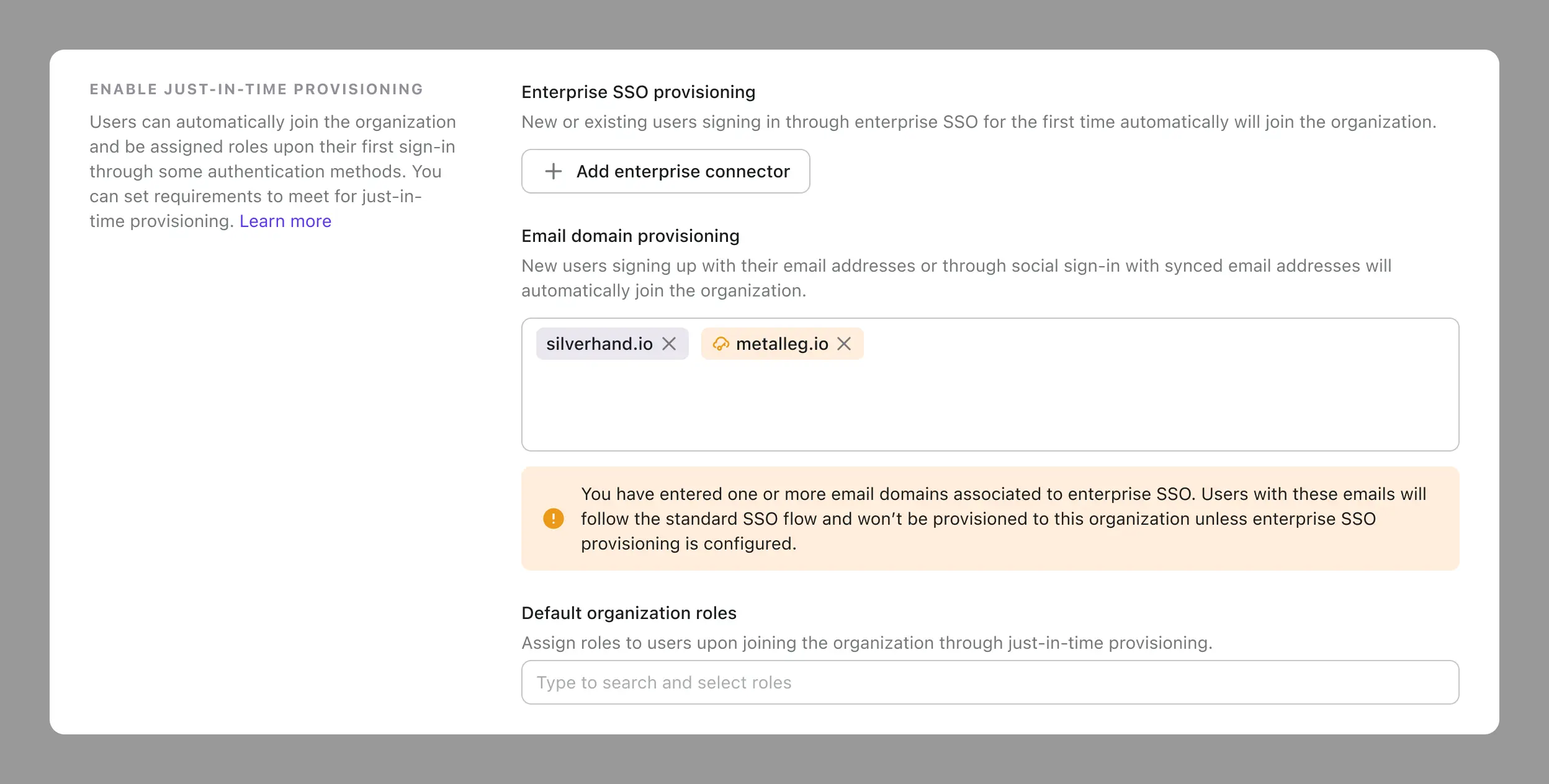 Um dies zu adressieren, zeigen wir eine Warnmeldung bei der Konfiguration an. Stelle sicher, dass du diesen Fall behandelst, indem du den richtigen SSO-Connector auswählst, um die Enterprise SSO Bereitstellung zu aktivieren, und verlasse dich nicht auf die E-Mail-Domain Bereitstellung.