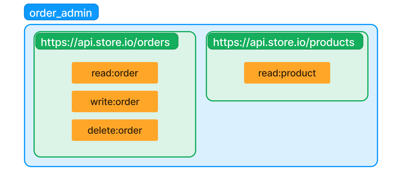 La figura anterior muestra que el permiso read:item en el recurso https://api-1.store.io es diferente del permiso read:item en el recurso https://api-2.store.io.