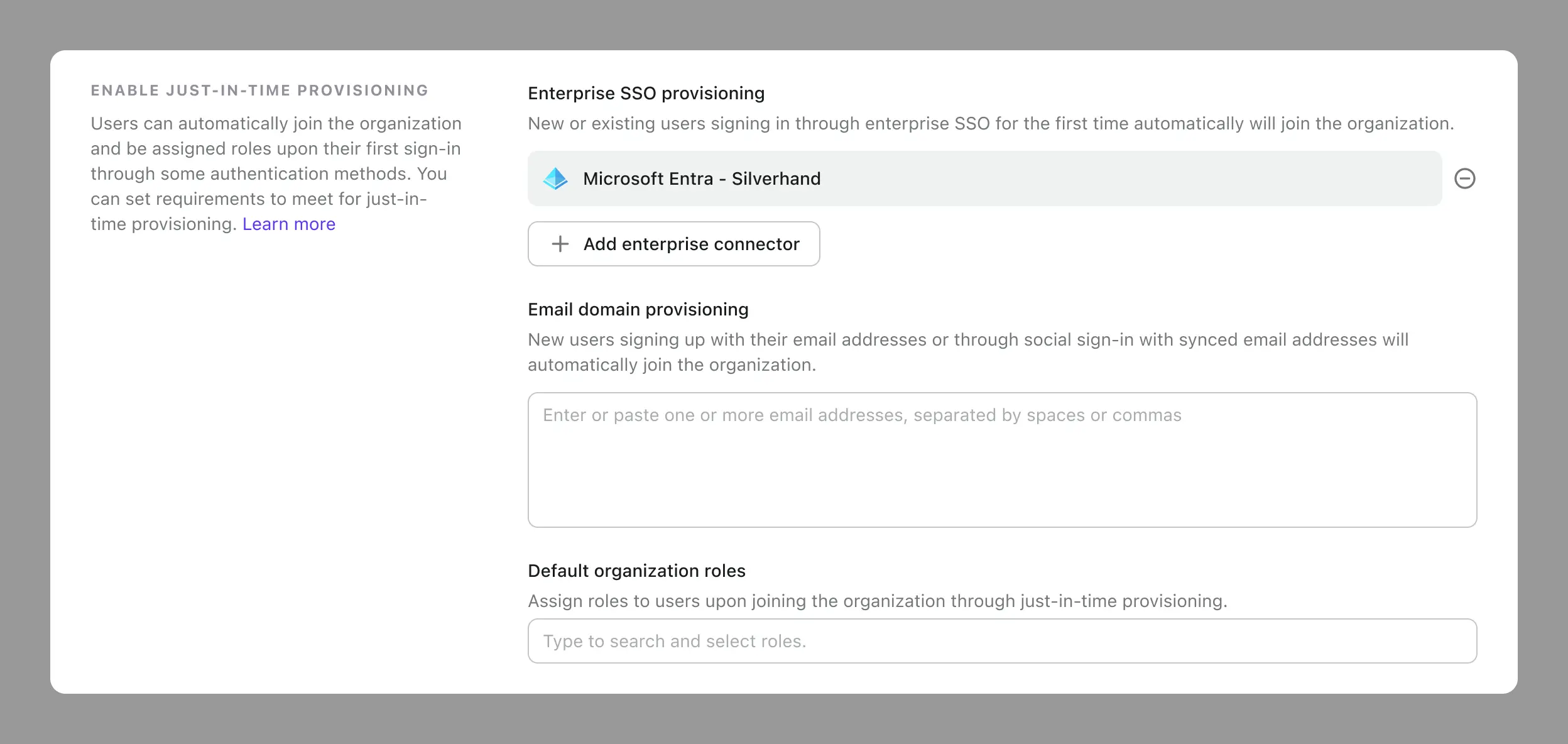 例えば、既存のユーザーにメールドメインプロビジョニングを有効にし、後で異なるロールを持つ別のユーザーグループをオンボードしたい場合、以前にオンボードされたユーザーに新しいロールを割り当てるべきでしょうか?これは「ジャストインタイム更新」の複雑なシナリオを生み出します。正確な動作は、アプリケーションと IdP の統合がどのように構成されているかによって異なることがよくあります。この制御をあなたに委ね、新しいアカウント作成と組織オンボーディングの最も頻繁なシナリオを自由に設計できるようにしています。