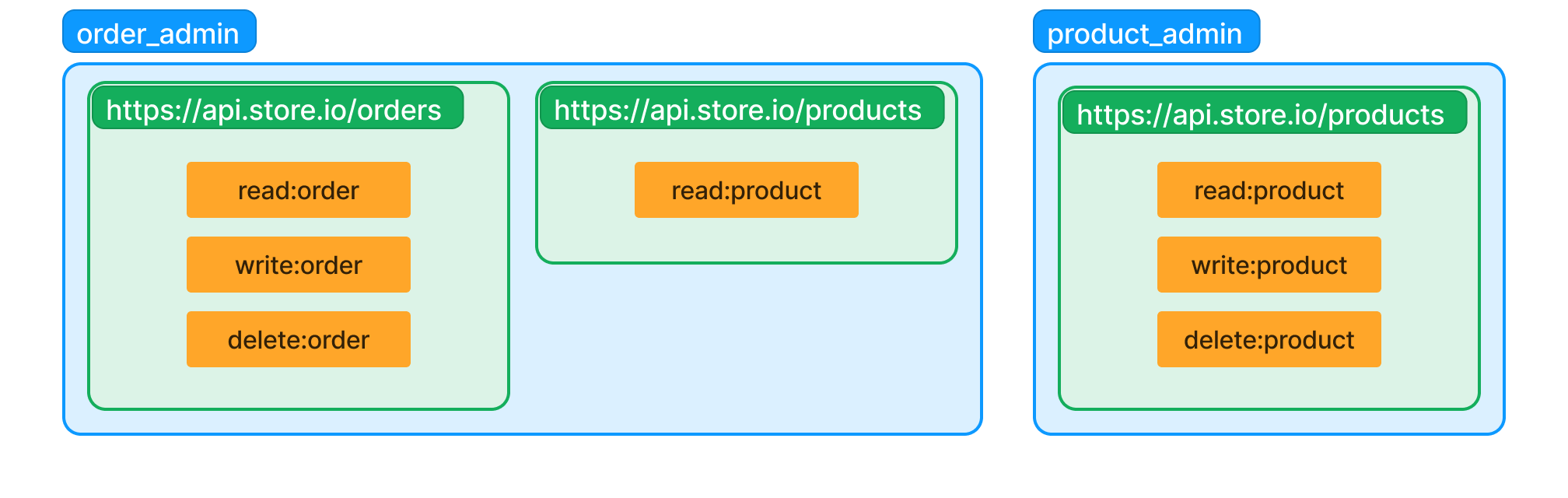 A figura acima mostra que a permissão read:item no recurso https://api-1.store.io é diferente da permissão read:item no recurso https://api-2.store.io.